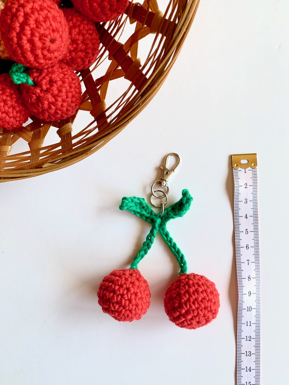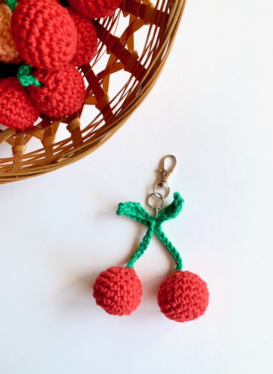 Adicione um toque de diversão aos seus acessórios diários com o nosso bag charm de cerejas, feito à mão em croché.
