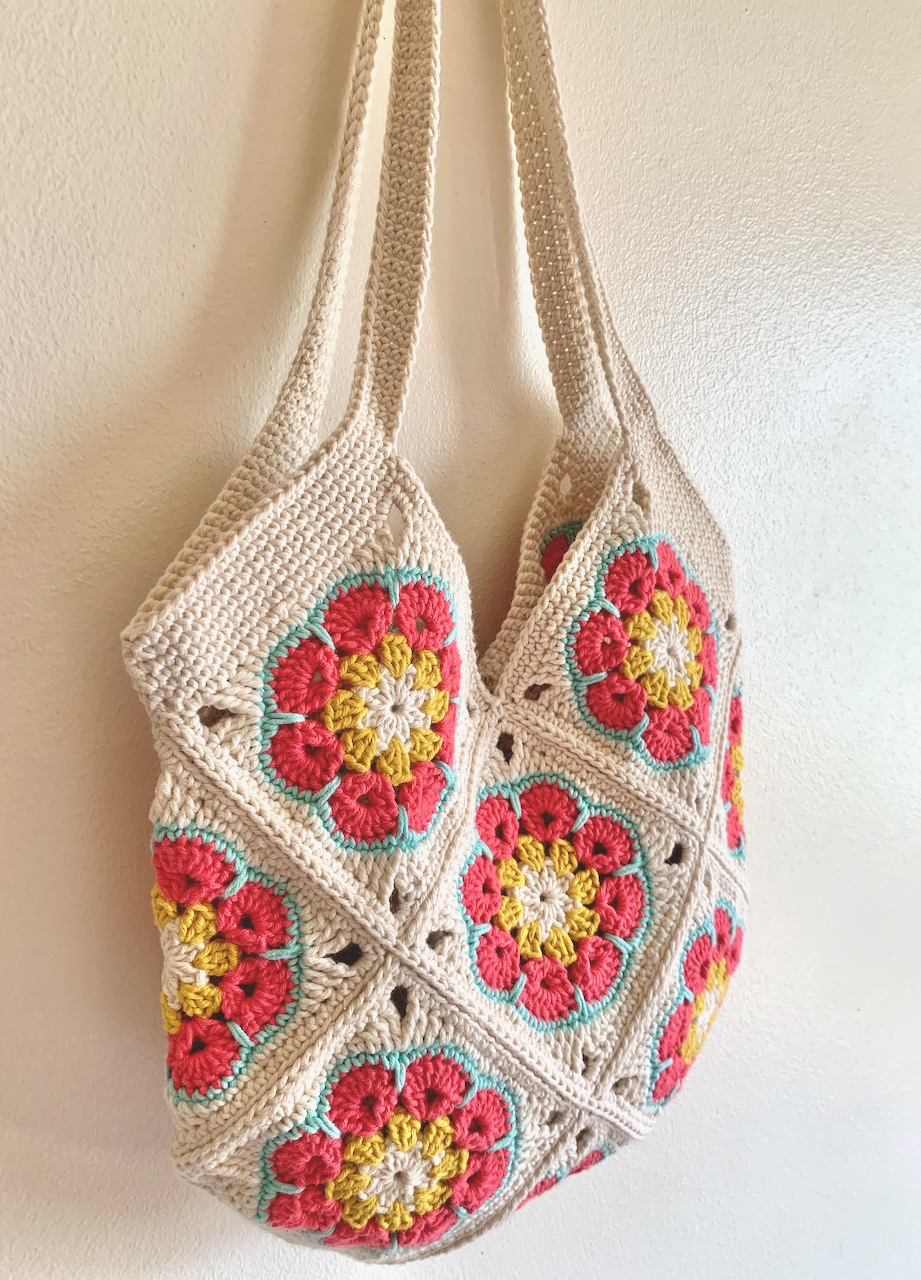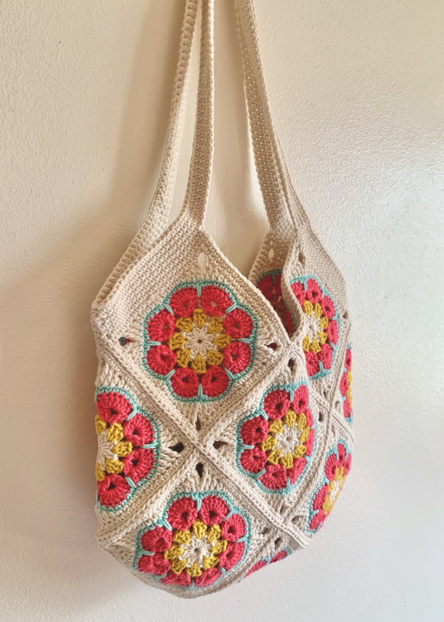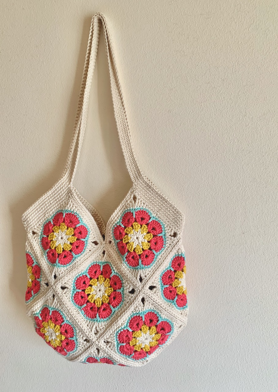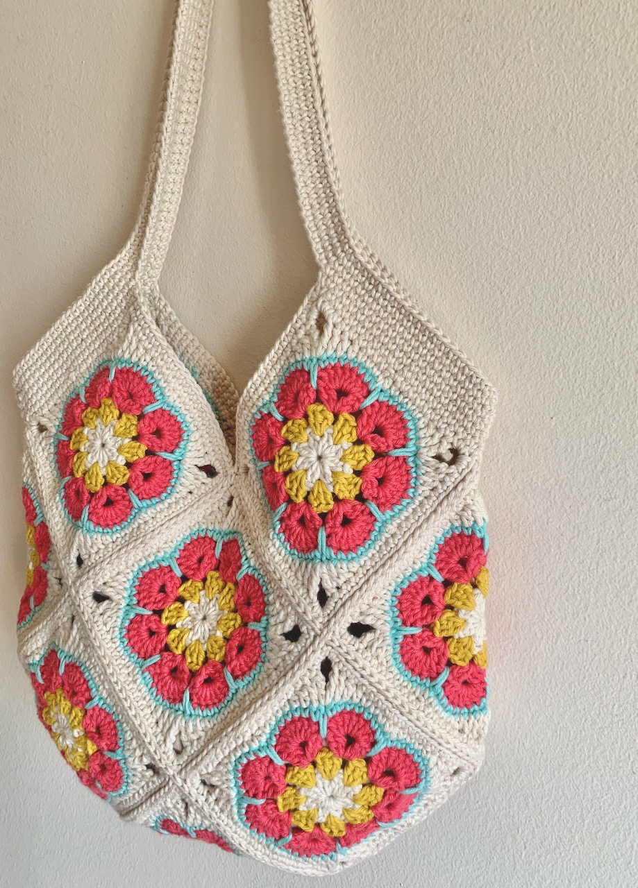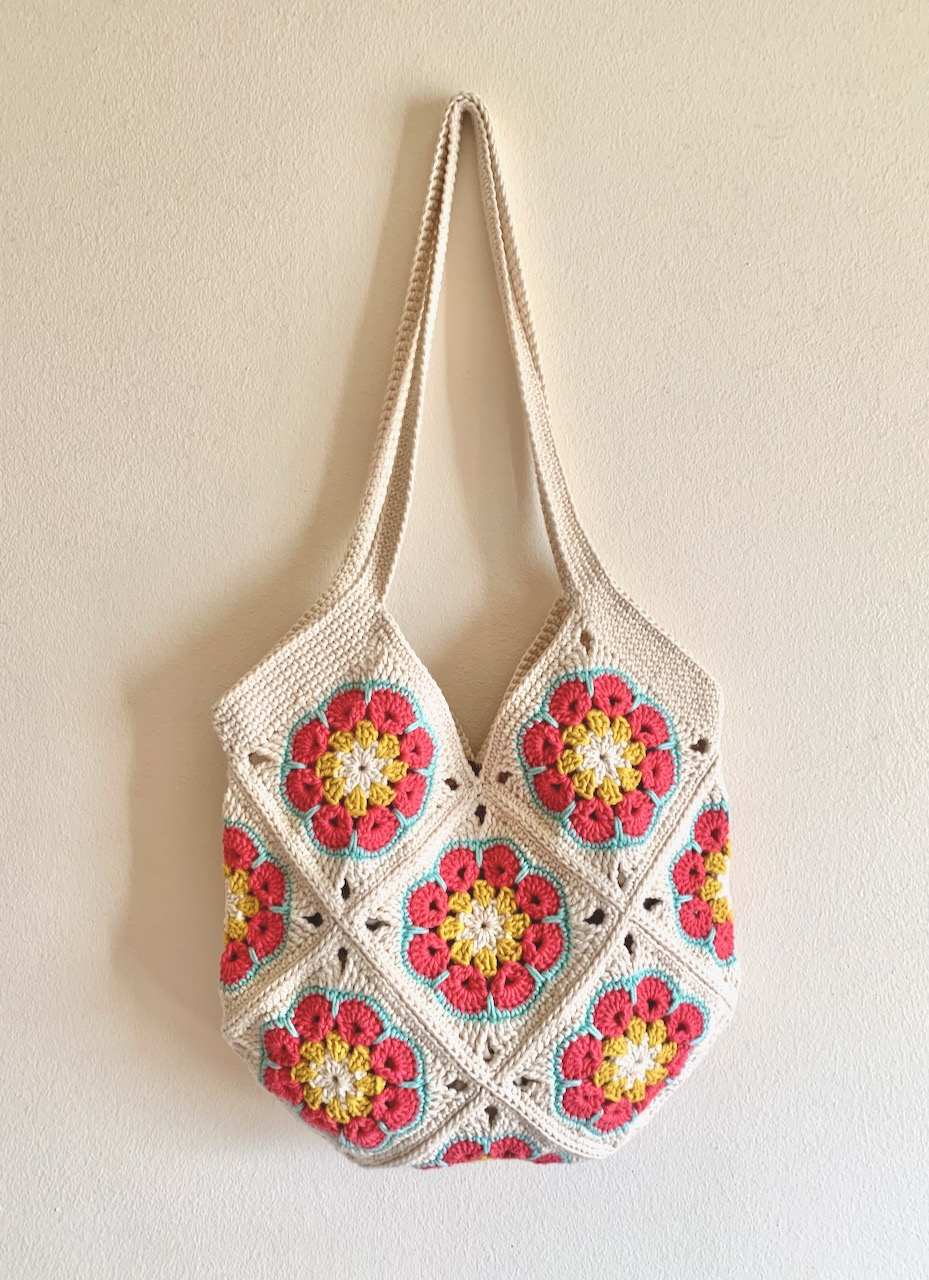 Descubra a beleza de um saco em croché feito à mão, com o design granny square - flor africana.
