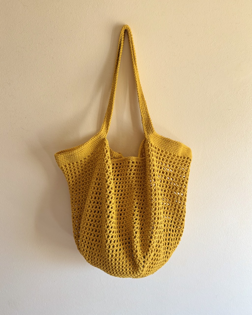 Saco amarelo de malha com padrão de pontos largos pendurado na parede