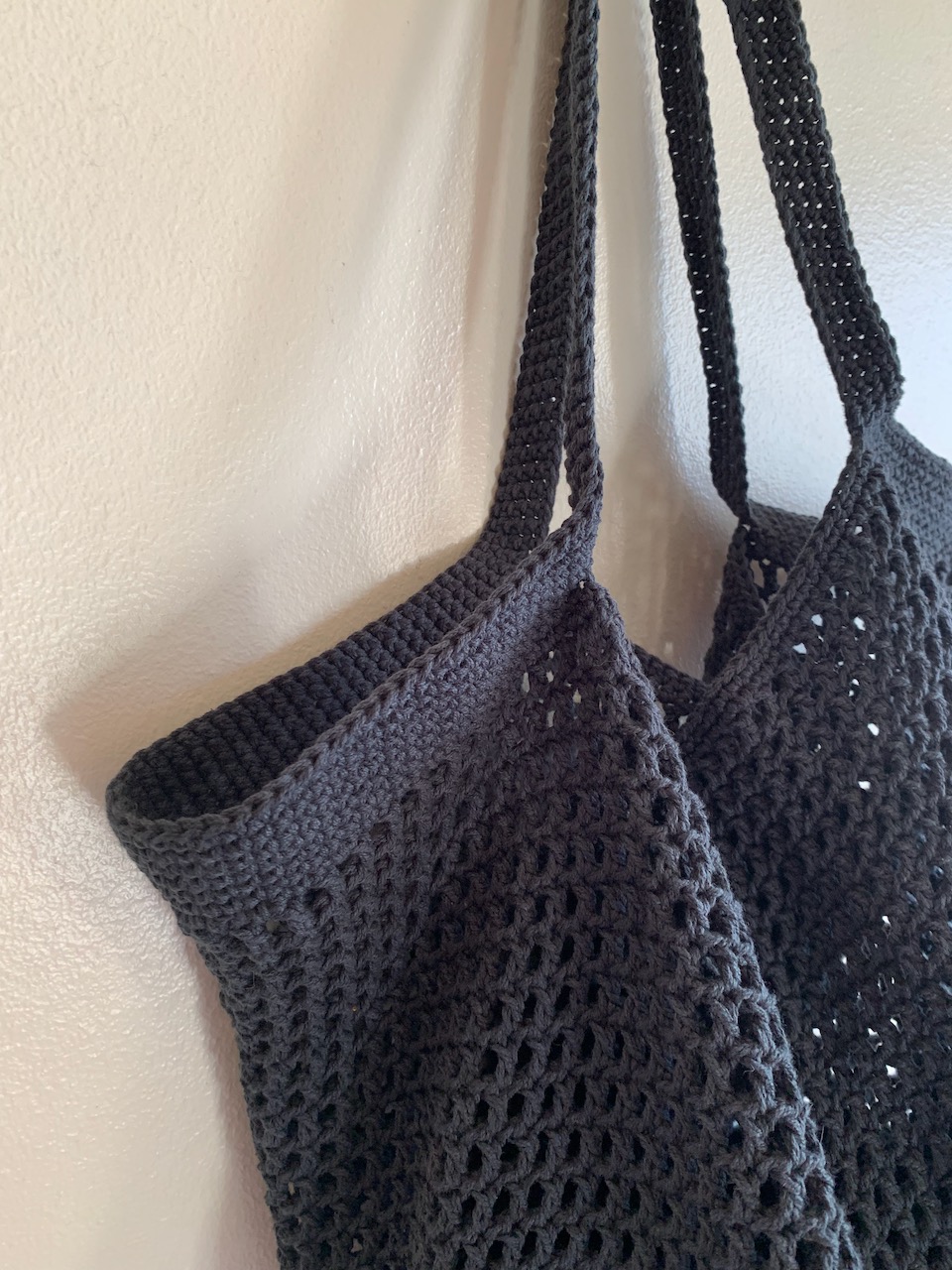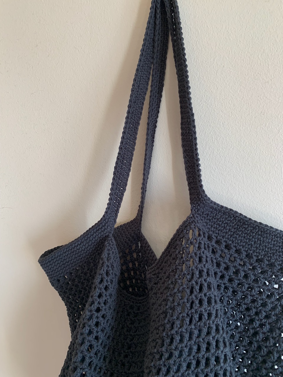 Saco de malha cinzento escuro com alças pendurado na parede