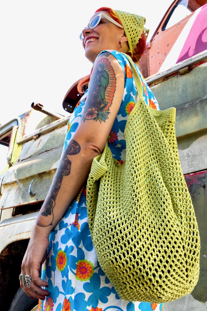 Mulher com vestido floral e bolsa verde de malha junto a um veículo envelhecido